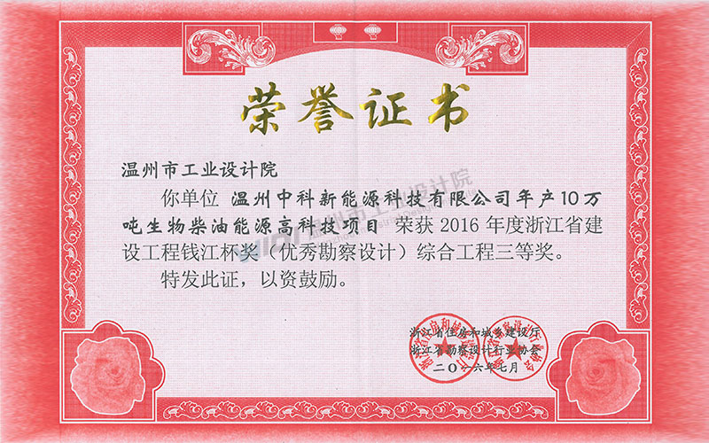 溫州中科新能源科技有限公司年產(chǎn)10萬(wàn)噸生物柴油能源高科技項(xiàng)目 錢江杯 綜合工程三等獎(jiǎng)