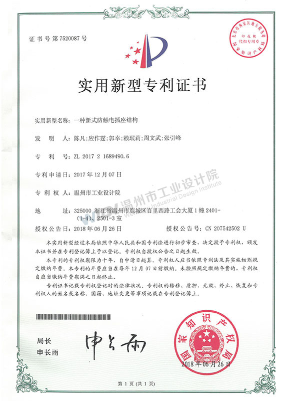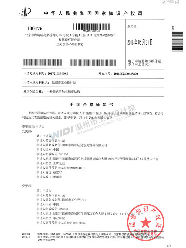 一種新式防觸電插座結(jié)構(gòu)手續(xù)合格通知書 (1)