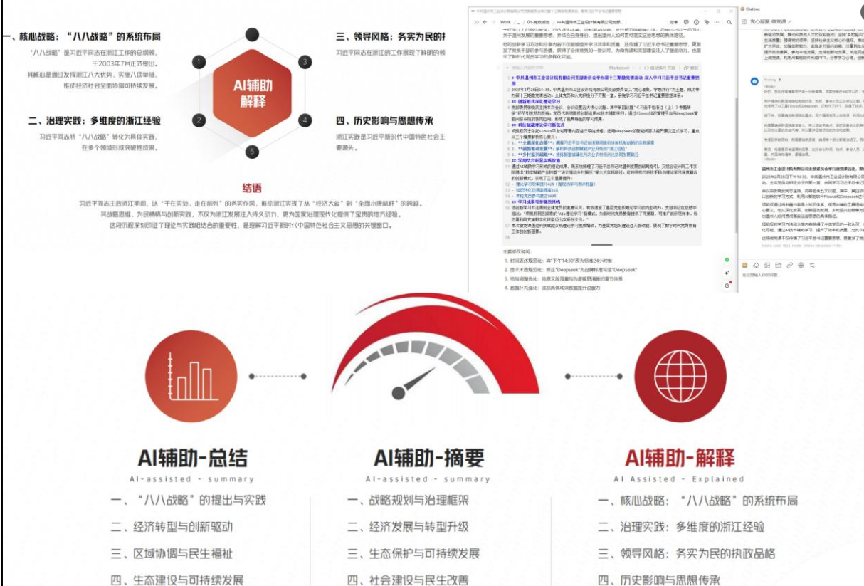 項凱權同志依托Flowus平臺對原著內容進行系統(tǒng)梳理了習近平總書記對浙江以及溫州發(fā)展的戰(zhàn)略指引,運用DeepSeek的智能問答功能開展交互式學習,重點從三個維度解析核心要義:一是全面深化改革,闡釋習近平總書記在浙江期間推動體制機制創(chuàng)新的實踐探索;二是創(chuàng)新驅動發(fā)展,解析科技創(chuàng)新賦能產業(yè)升級的"浙江經驗";三是鄉(xiāng)村振興戰(zhàn)略,提煉新型城鎮(zhèn)化與農業(yè)農村現(xiàn)代化協(xié)同發(fā)展路徑。